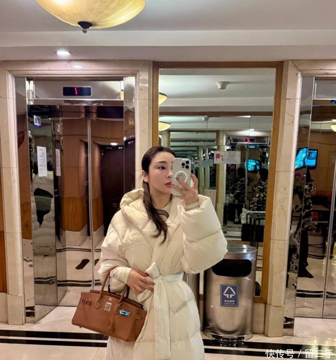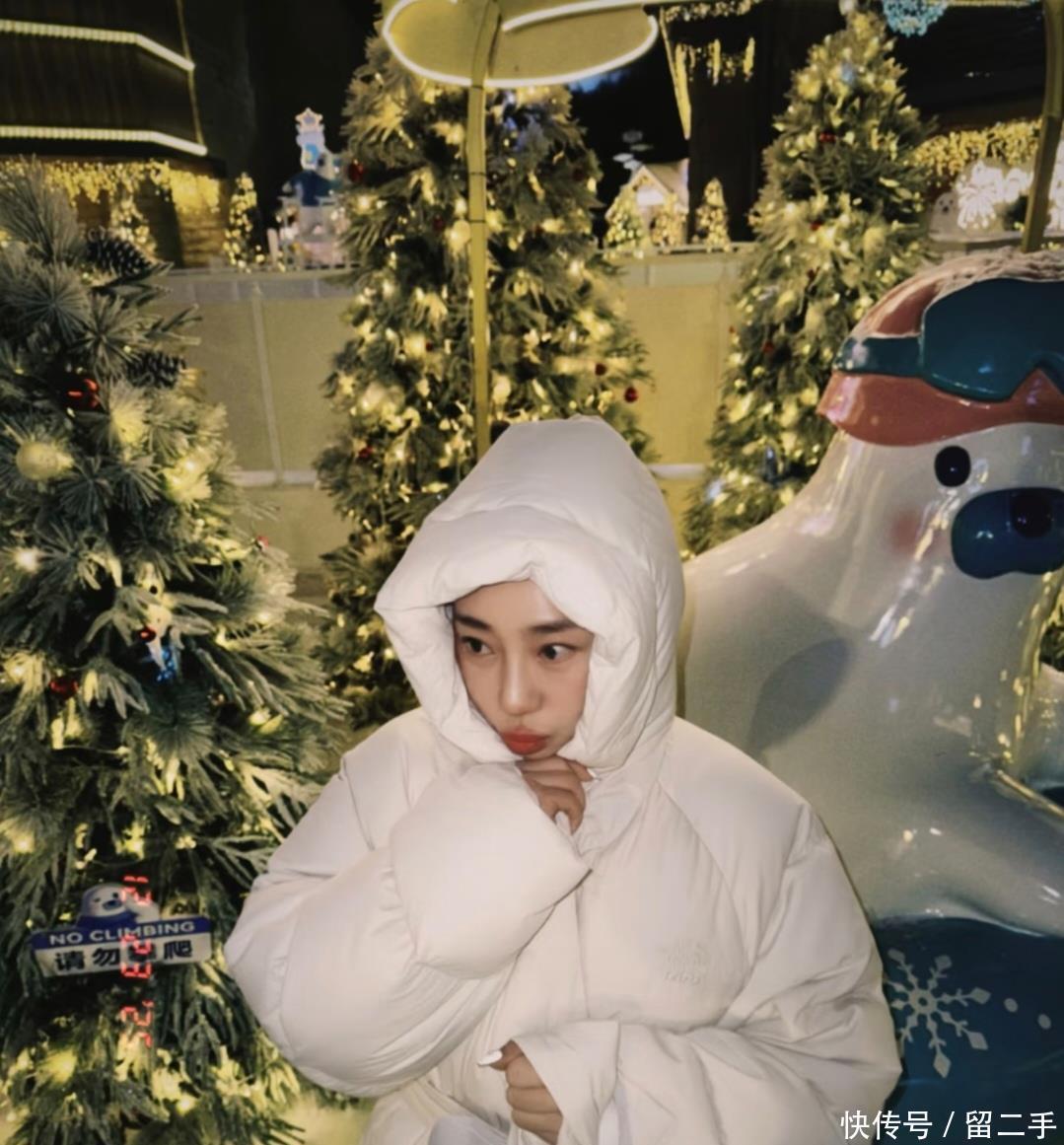 刘帅扎着马尾,穿着一件长及脚踝的白色羽绒服,腰间还系着一条腰带,看起来既高挑又挺拔,身材也显得格外苗条。