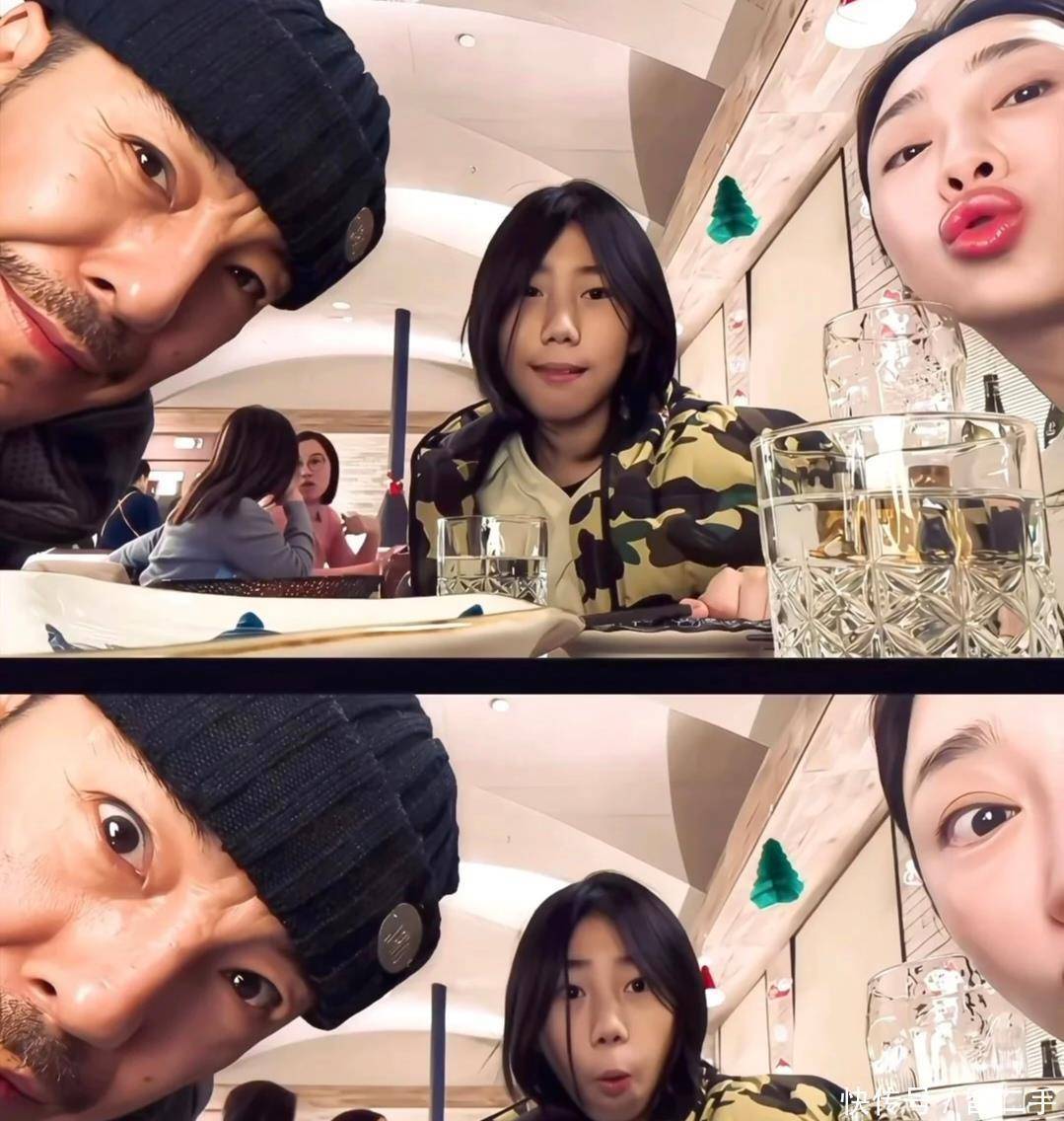 还记得那张三人合照吧,继子坐在中间,海一天和刘帅分别站在两旁,两个人还对着镜头比比划划,氛围真是温馨又融洽。