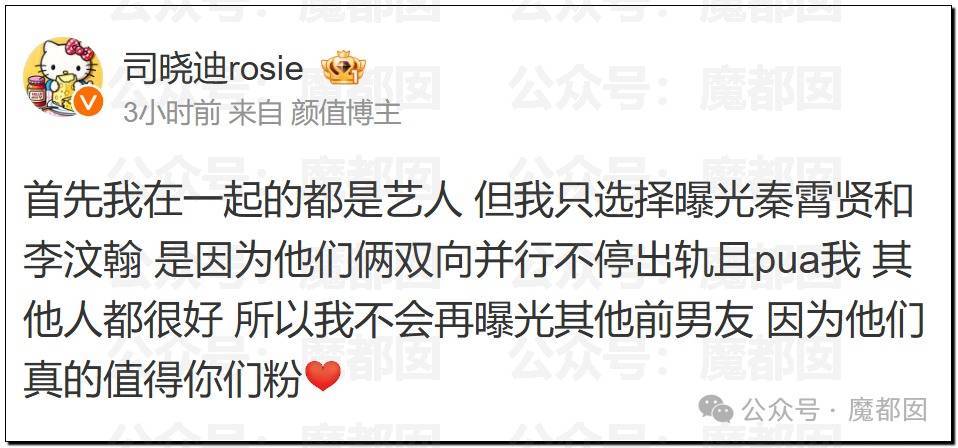 2026年开年的内娱被一个名字搅得天翻地覆——司晓迪。这个曾因颜值和美妆内容在平台积累关注的网红,用一场堪称“地毯式轰炸”的爆料,将鹿晗、蔡徐坤、林更新等12位顶流男艺人拖入舆论漩涡。事件的导火索是她在社交平台发布的长文,自称30岁前与多位艺人有过亲密接触,不仅列出具体名单,还附上聊天记录、开房记录等“实锤”,直指部分艺人行为导致其心理健康出现问题,要求公开道歉。 这场风波并非毫无预兆。早在2024年,司晓迪就因一张与秦霄贤的居家游戏照,卷入德云社演员的出轨传闻。当时她与节目发起人辛雨锡联合指控秦霄贤,而当事人始终未作回应,让事件不了了之。2025年情人节,她又将矛头对准李汶翰,晒出对方男扮女装赴约的照片和视频通话截图,控诉恋爱期间遭受“精神控制”。更令人咋舌的是,同年10月她还爆料李云迪曾“疯狂约见”并拉黑自己,只是当时网友多认为其有炒作嫌疑。从秦霄贤到李汶翰,再到如今的“十二顶流”,司晓迪的爆料对象层级不断升级,证据链也从模糊的聊天记录发展到具体的订房信息,手法愈发“精准狠”。