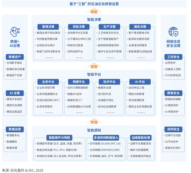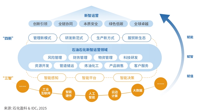 《白皮书》首次系统性地提出了“新智运营”概念。石油石化新智运营,是指以数字化、智能化技术为基石,以“智能感知、智能平台、智能决策”为核心能力,通过贯通资源开发、管道储运、炼油化工、产品销售及客户服务等产业环节,深度融合多源数据与工业知识,系统构建“数据×知识”双轮驱动、协同高效的新型运营体系。该体系旨在推动形成管理新模式、研发新范式、生产新方式与服贸新生态,持续为石油石化企业感知赋值、认知赋智、应用赋能,最终实现创新引领、全链协同、本质安全、绿色低碳和全球卓越的高质量发展目标。