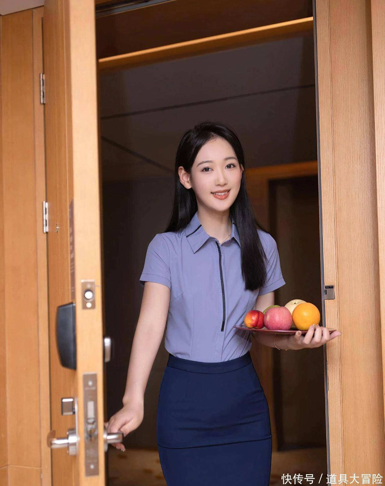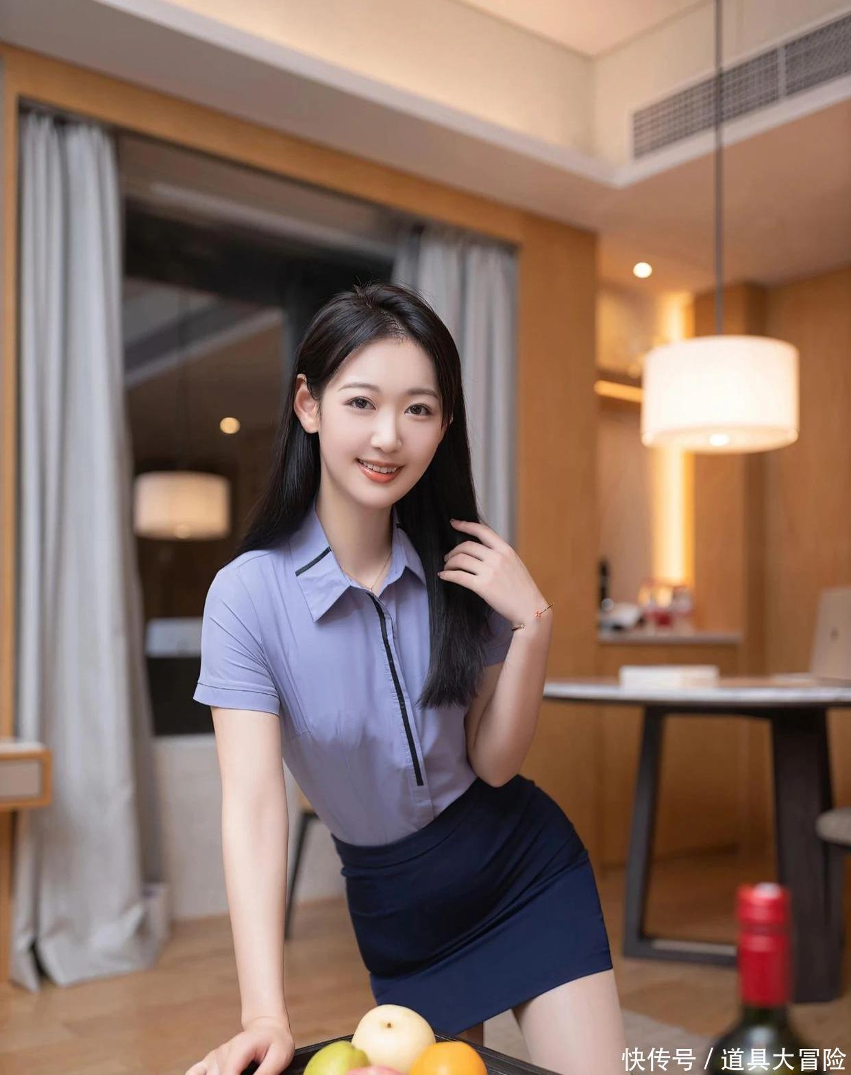 唐安琪这组照片真的让我反复欣赏!每一张都像在说:优雅是种本能。浅紫色短袖衫配深蓝包臀裙,颜色清爽柔和,但剪裁精准勾勒出她的纤细腰身和流畅臀腿线。尤其第四张图中她双手捧盘站立,裙摆下双腿笔直,黑色高跟鞋撑起全身气场,看起来端庄又轻盈。这种效果,恰恰回应了“包臀裙只能性感”的刻板印象。